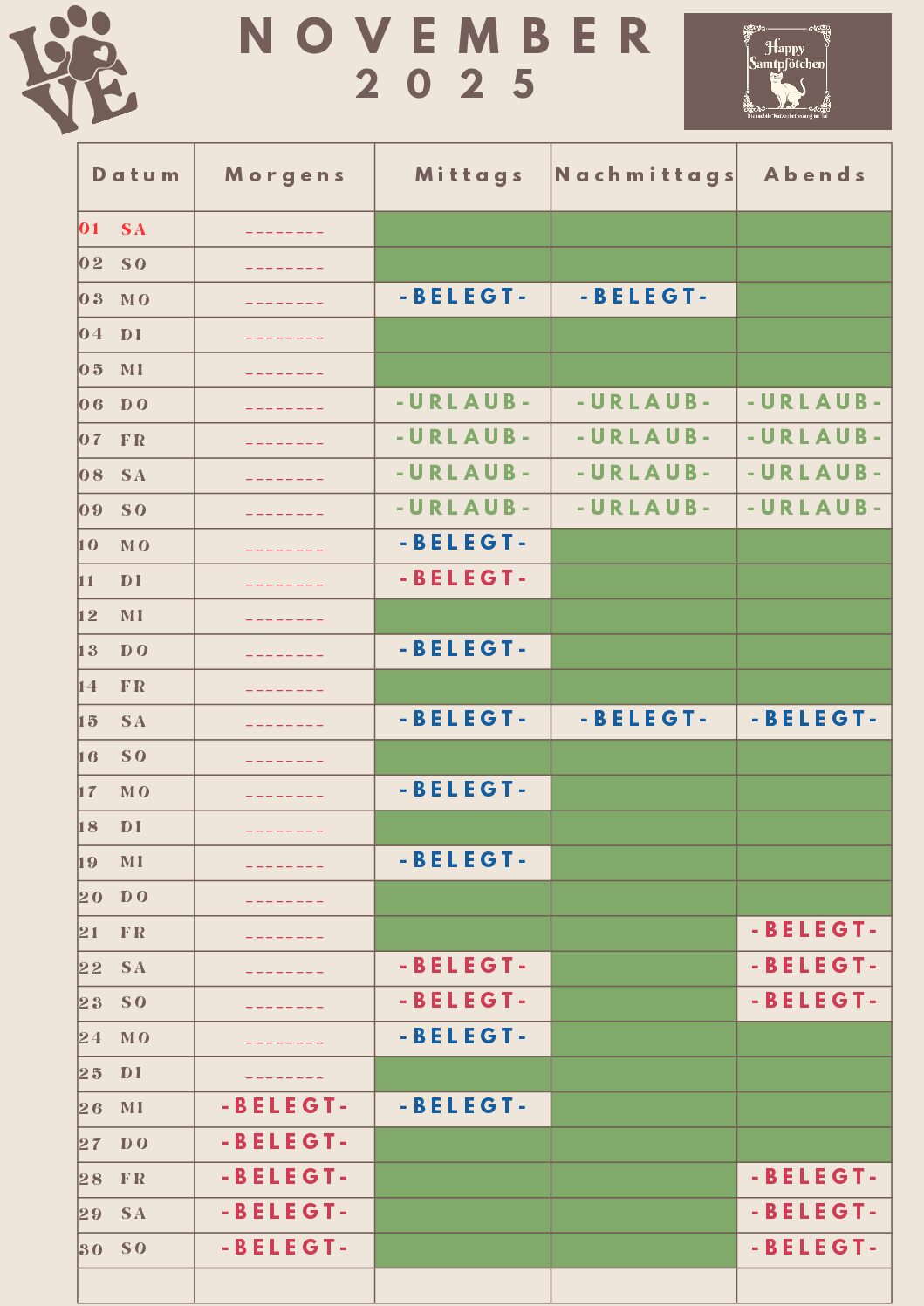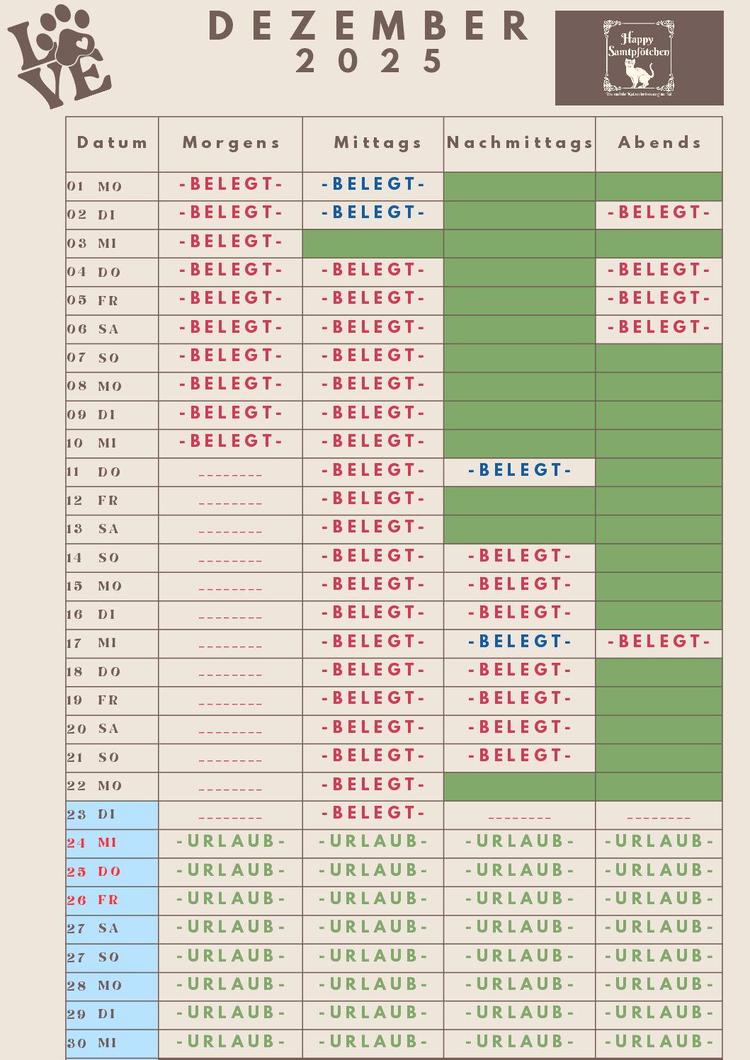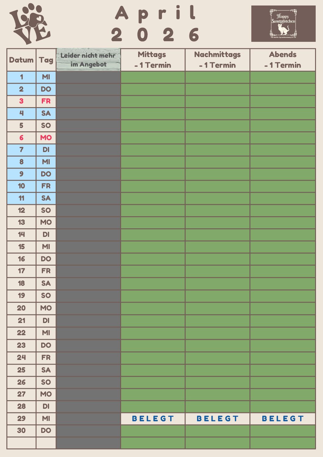 – Bitte immer mal wieder reinschauen, aufgrund von Änderungen ist vielleicht der Wunschtermin doch noch/wieder frei – Ihr könnt gerne auch anfragen –
